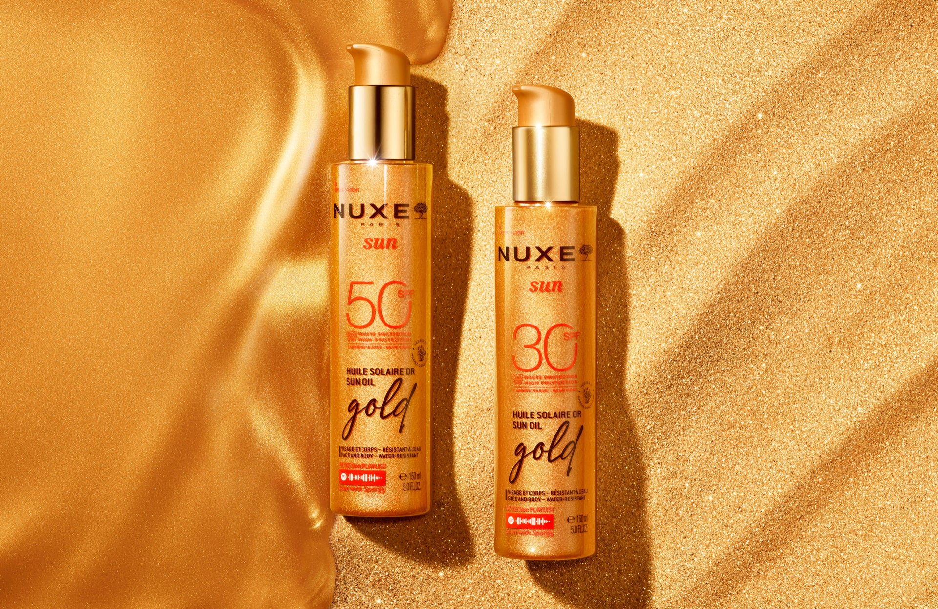 Découvrez nos premières huiles haute protection sublimatrices SF30 et SPF50, infusées de nacres or irisé 100% d’origine naturelle. La protection large spectre UVA/UVB et la protection lumière bleue sont assurées grâce au système filtrant breveté de NUXE⁽²⁾, tout comme la prévention contre le photo-vieillissement cutané prématuré. 100% des femmes trouvent leur peau sublimée et lumineuse⁽³⁾.