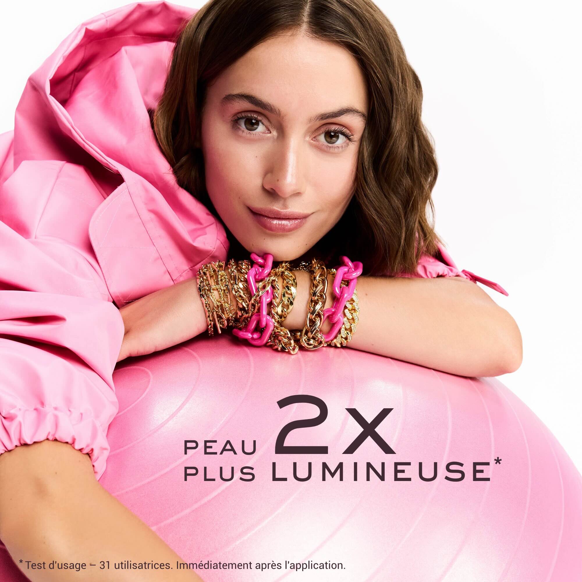 Ce soin allie la concentration d'un sérum à des nacres naturelles rosées réflectrices de lumière. Il offre un boost d'éclat instantané à la peau, repulpe et renforce la barrière cutanée. En une application, la peau est sublimée et 2 fois plus lumineuse.