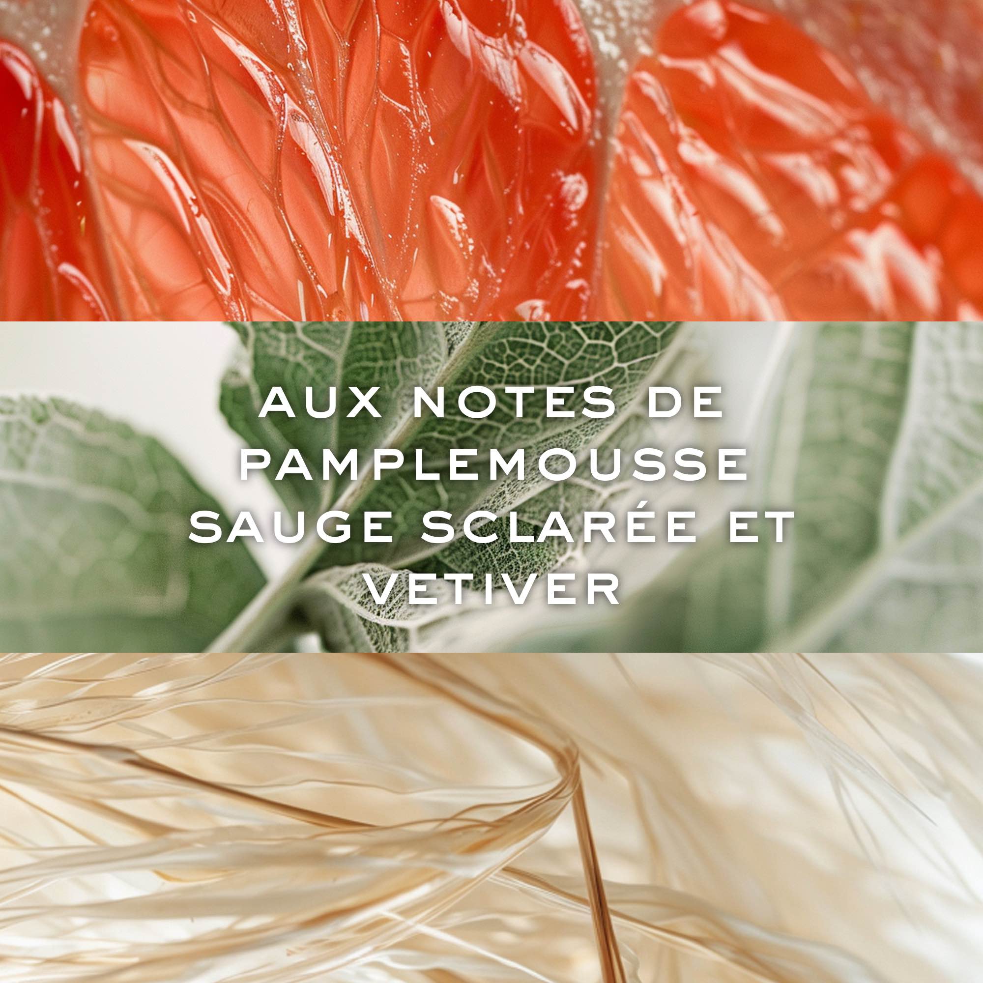 Dès le départ la vivacité aromatique de la baie de Genièvre et la fraîcheur pétillante du Pamplemousse se mêlent à la chaleur épicée du Poivre noir. L'élégance du cœur se révèle grâce à une sauge sclarée piquée d'une touche vibrante de cardamome. Une sensualité poussée à l’extrême grâce à un équilibre parfait entre un musc blanc associé au vétiver pour la profondeur et le caractère.