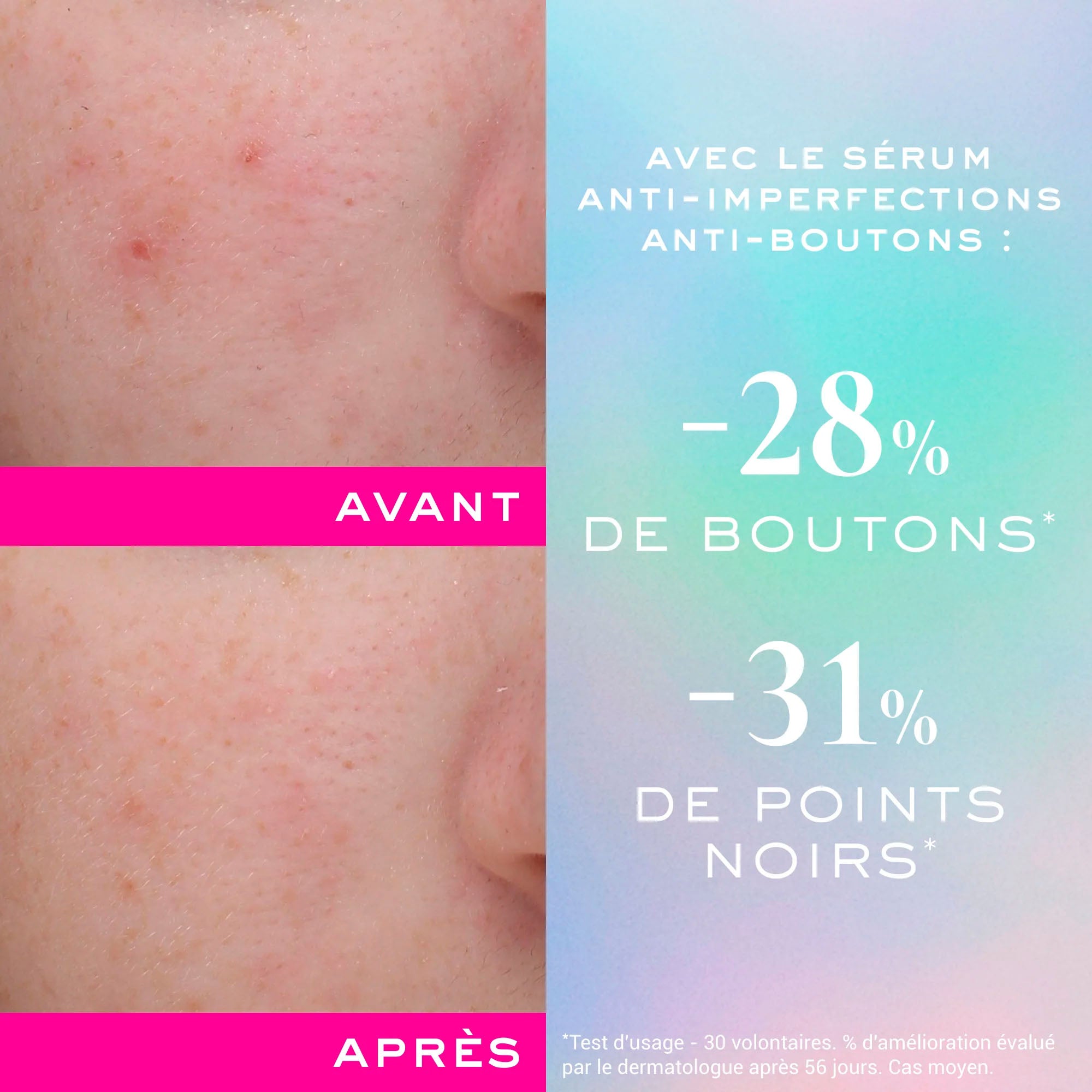 Après 2 mois, les marques liées aux imperfections sont atténuées⁽²⁾ et la qualité de la peau est visiblement améliorée : -28% de boutons⁽³⁾ et -31% de points noirs⁽³⁾.