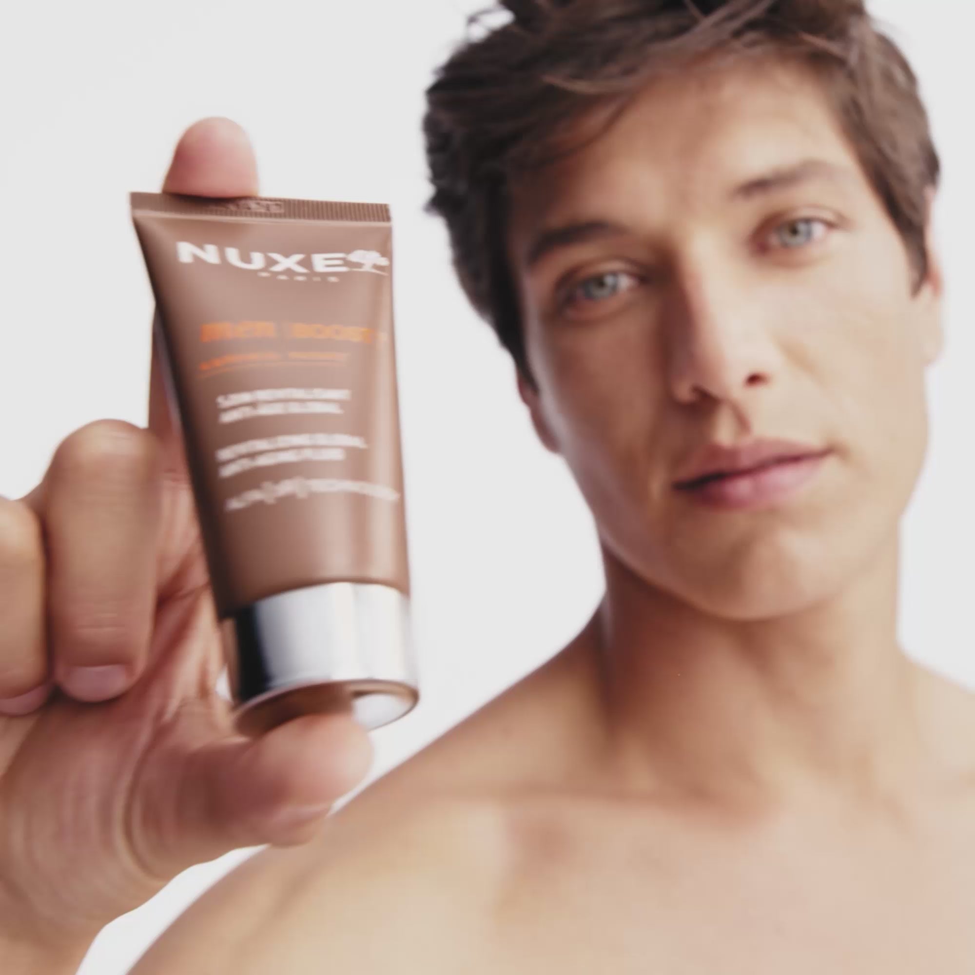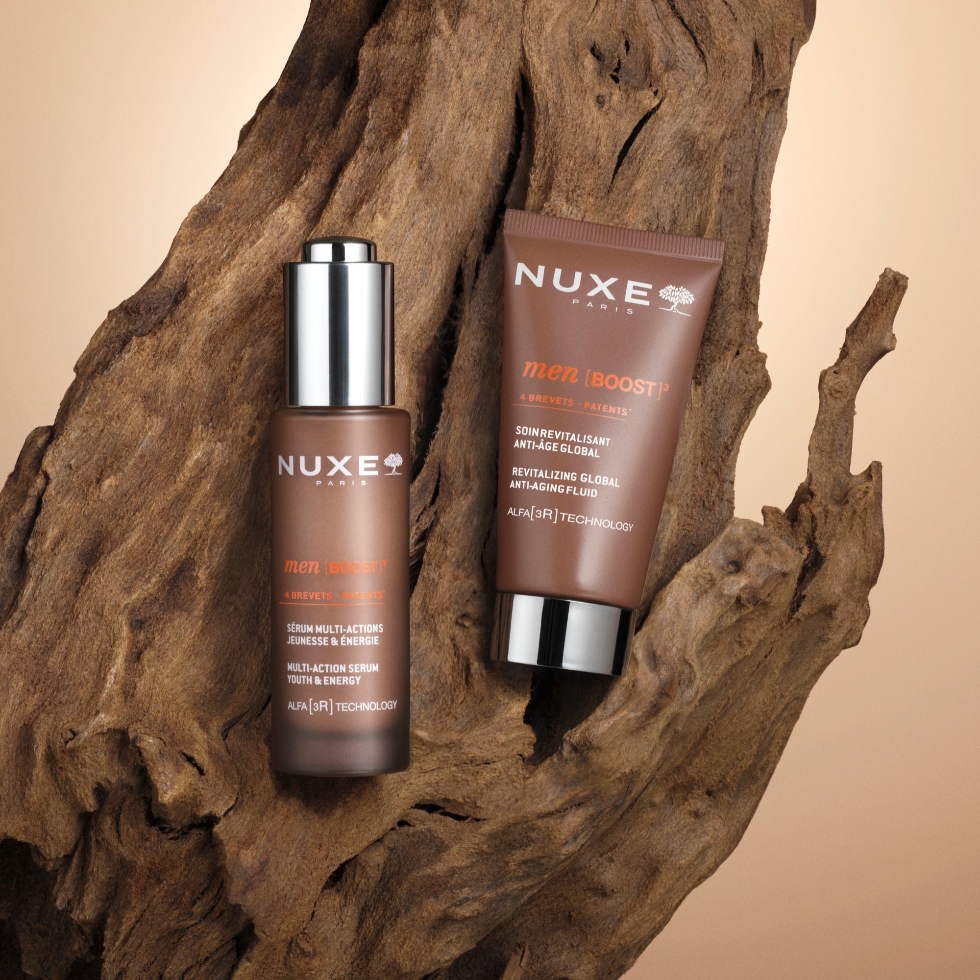 NUXE Men [BOOST]³, la gamme experte qui conjugue efficacité et sensorialité pour révéler toute la force de votre peau. Enrichie en oléo-extrait de frêne breveté. En complément, la TECHNOLOGIE ALFA [3R]⁽¹⁾plus efficace que le rétinol⁽²⁾revitalise, régénère et resurface la peau.